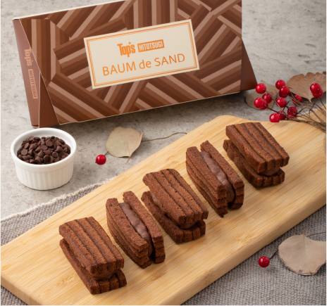 しっとりとしたチョコレート味のバウムクーヘンに、チョコチップを練り込んだチョコクリームをたっぷりとサンドしました。