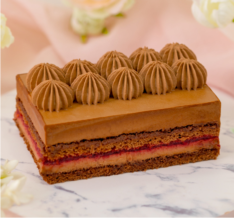 チョコレートムースとココアスポンジに、甘酸っぱいフランボワーズジュレを組み合わせました。 ココアスポンジにはフランボワーズリキュールをしみ込ませ、香り高い味わいとムースの濃厚なカカオが味わえる限定のケーキです。
