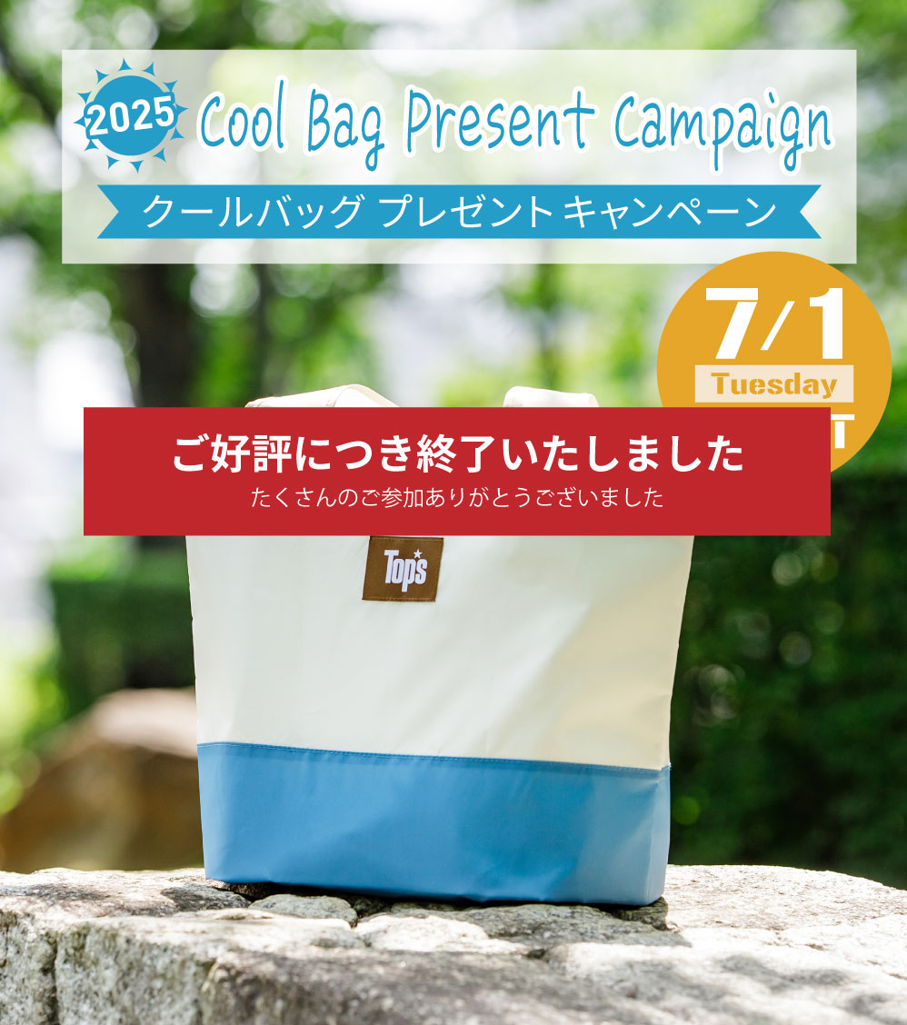 概要 | 対象店舗(下部参照)にて税込500円のお買い上げで1ポイントをLINEショップカード(または紙製カード)に押印いたします。 合計10ポイントを貯めて頂くと、Top'sオリジナルデザインのクールバッグを1枚プレゼントいたします。 |